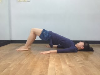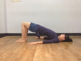 しかし、私のヨガの流派はアライメント(身体の位置)がすごく細かい(丁寧)なので、先生のリハビリ中も気になってしまいました。こちらはヨガのポーズでもおなじみの橋のポーズです。おしりやもも裏の筋肉トレーニングでおしりを上げ下げするというものでした。私の流派のヨガではかかとの位置がとても重要なんですが、その指示はないみたいでした。(まぁ。ヨガじゃないですし、あまり関係ないのかもしれません)