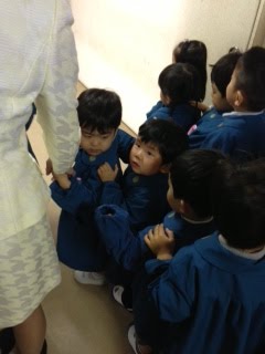 73名3クラスですって。多いなぁ。入園式を見て思ったのは、それぞれ個性があるなぁということ。物怖じせず堂々と歌う子もいれば、ママと離れて大泣きする子もいる、なにもしゃべれずに固まる子もいれば、先生達の人形劇に大声でつっこみを入れる子もいる。陸人みたいに小さい子もいれば、大きい子もいる。写真はママと手を話して電車ごっこをしながら子供だけでホールに入るところ。前から二番目の不安げな小さいのが一月生まれのうちの子です。斜め後ろの大きい子は六月生まれだそう。頭ひとつ以上違いますけど?!同級生だなんて驚きです。