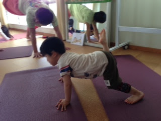 ヨガは時間を勘違いして大遅刻してしまいましたが、ヨガ後におやつを頂いて、そのおやつが陸人のアレルギー対策をご配慮頂き、大喜びで食べてました。普段我慢することも多いので嬉しかったです。しかし、カップケーキを満足しながら食べた後、他の親子が既製品のお菓子を出して食べていて、お腹すいたと大きな声で言う息子にどうぞと手渡ししてしまったのです。驚いて、「アレルギーがあるんです!」と陸人の手からはぎとり返し(慌ててたので感じ悪かったかも・_・;)、ささっとその場を離れましたが、案の定、息子は「食べたい、食べたい」と半泣きです。もとから手にしていなければ満たされていた心も、一度手にしたものを失うと心が不満をかかえる、だからすべてを手放すのがいいというのが古典ヨガ的だけど、子どもはかわいそうですよね。でも、私もアレルギーのある子どもの親だから、小さい子どもに直接お菓子を渡すなんて!って思いますが、アレルギーに無縁だったら気づかないですよね。こういうことって他にもありますよね。当事者でないとわからないこと。固定概念、自分の常識など凝り固まった「自分の考えのパターン」を崩すことも「本当の自分」を見つけていくために必要とされています。つまりは、視野を広く持っているといろいろ分かっていいよねって教えですね。